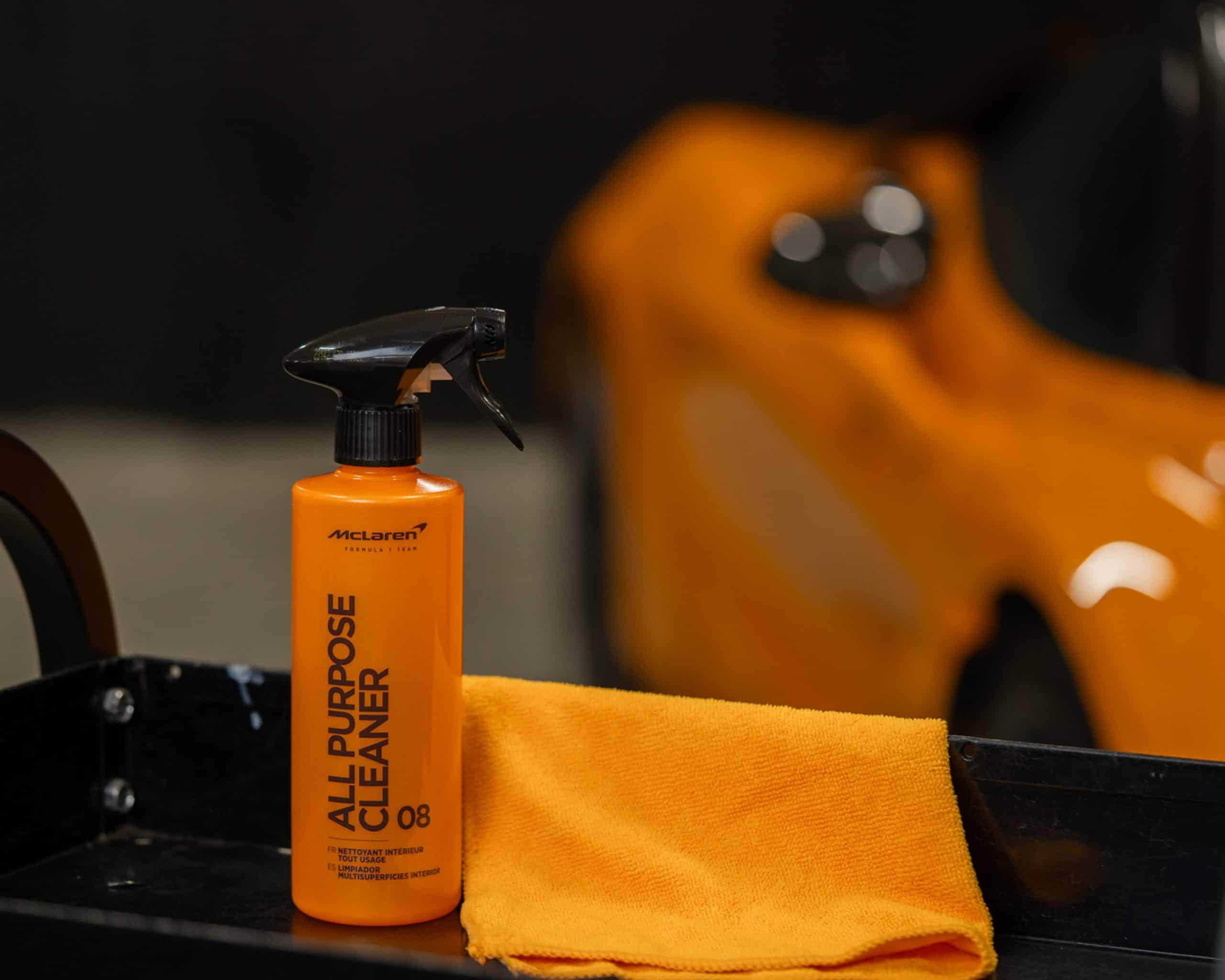 El limpiador multiusos de McLaren está diseñado para limpiar molduras de plástico y goma, superficies interiores, incluidas telas, vinilo, cubierta del motor y más.