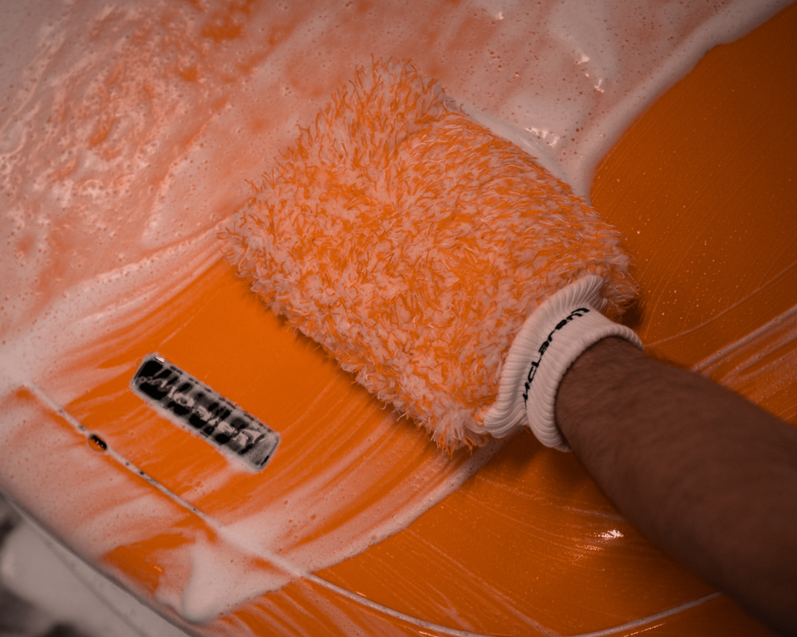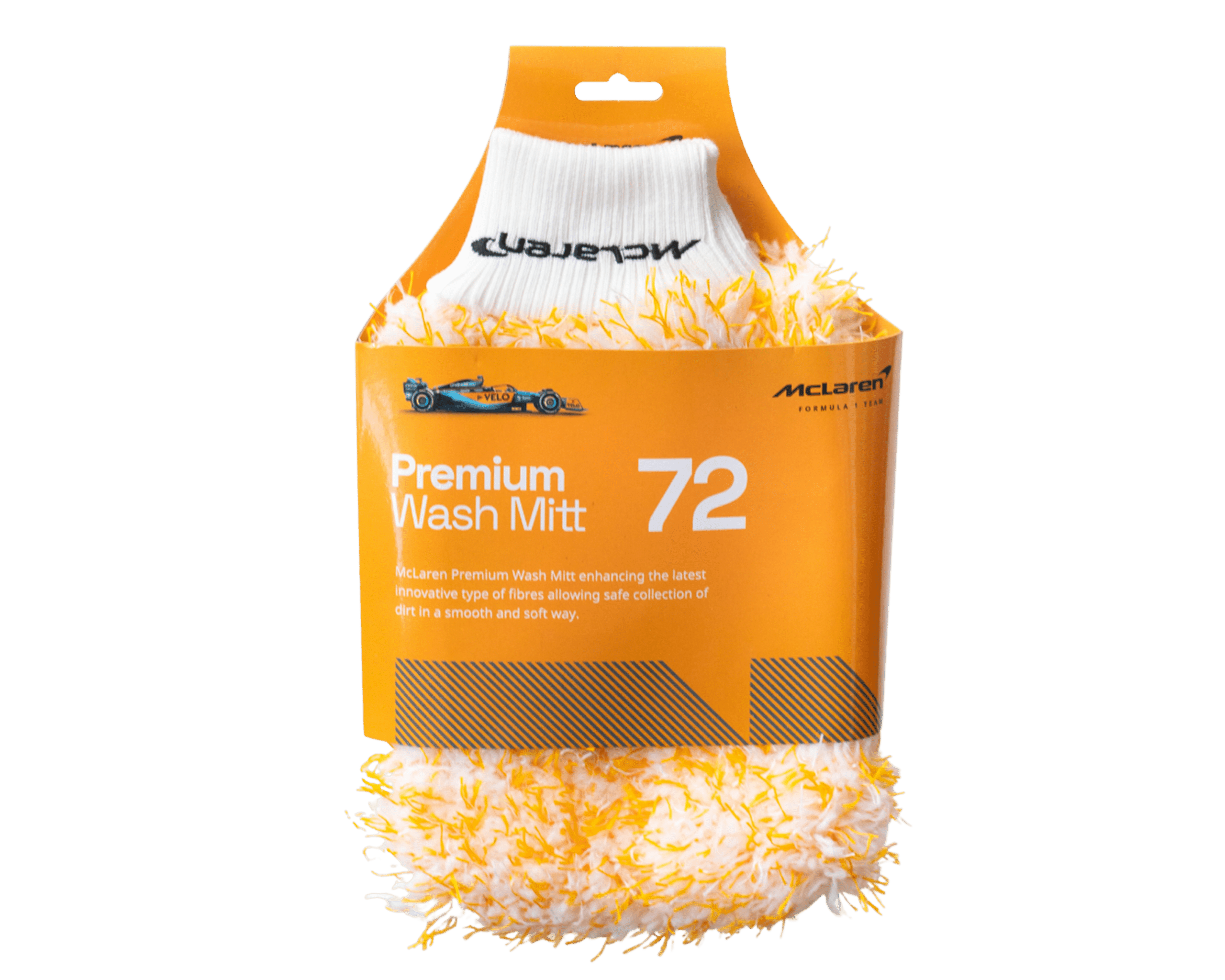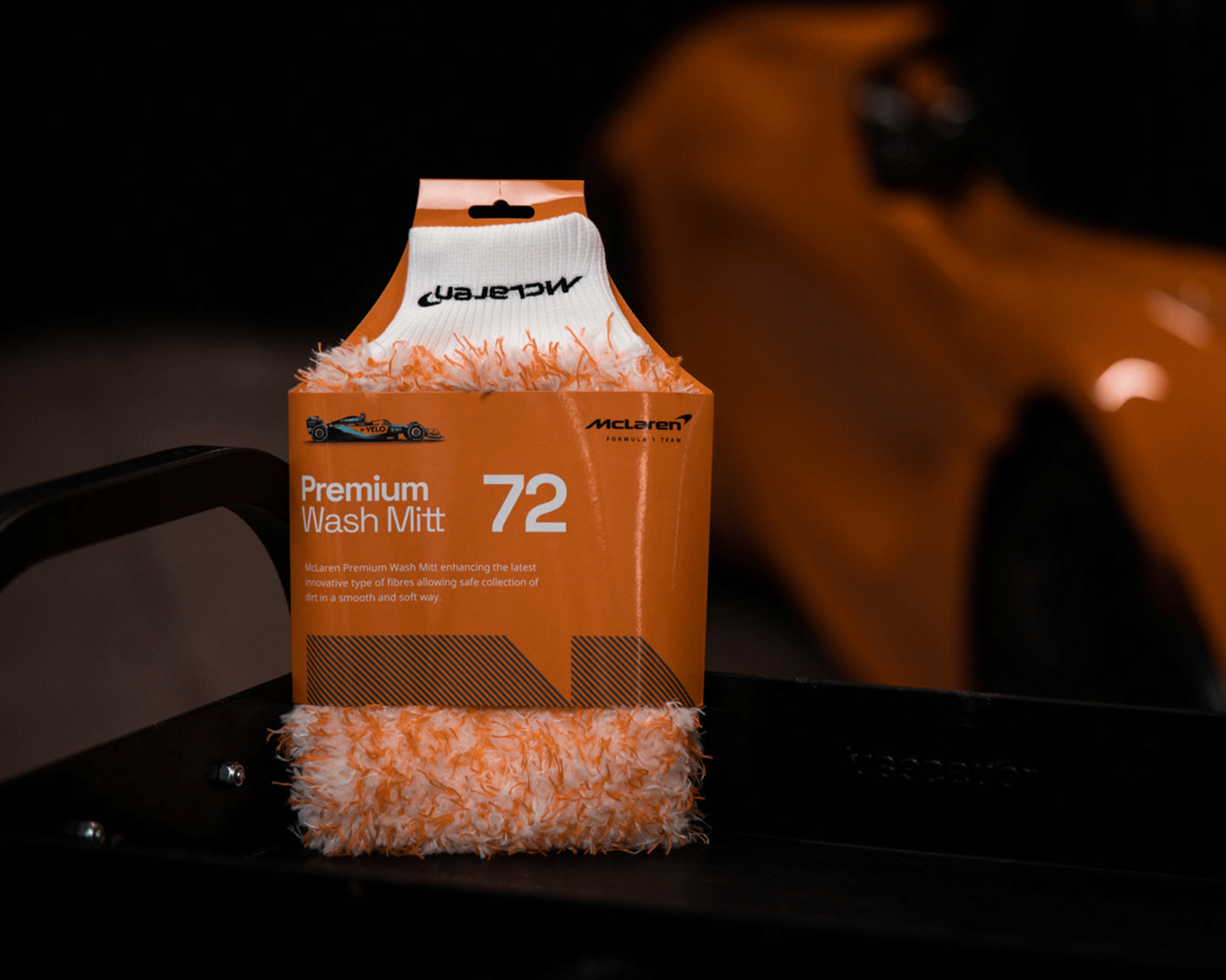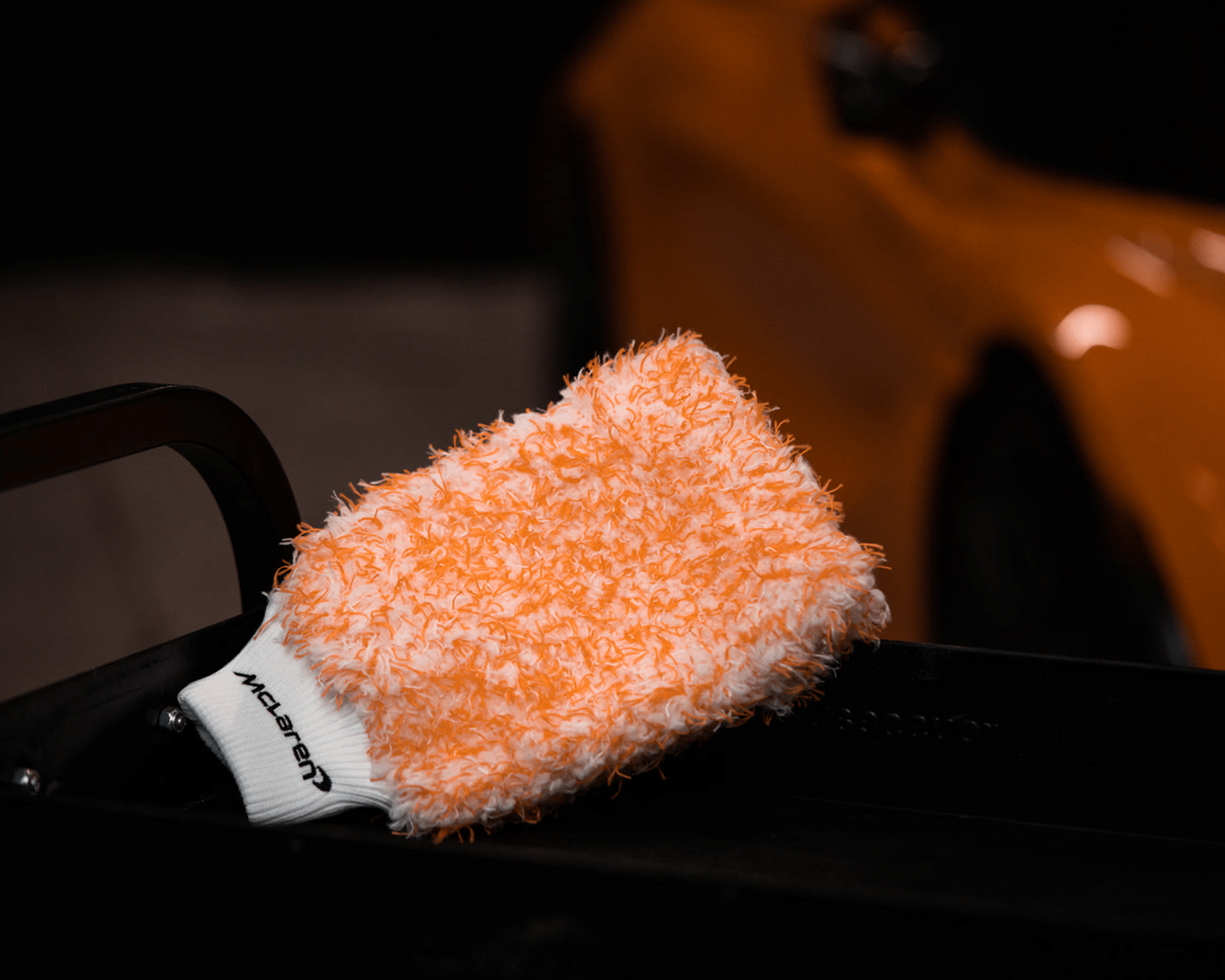 El guante de lavado de microfibra Mclaren Car Care Premium retiene una cantidad impresionante de espuma y garantiza un proceso de lavado sin remolinos.